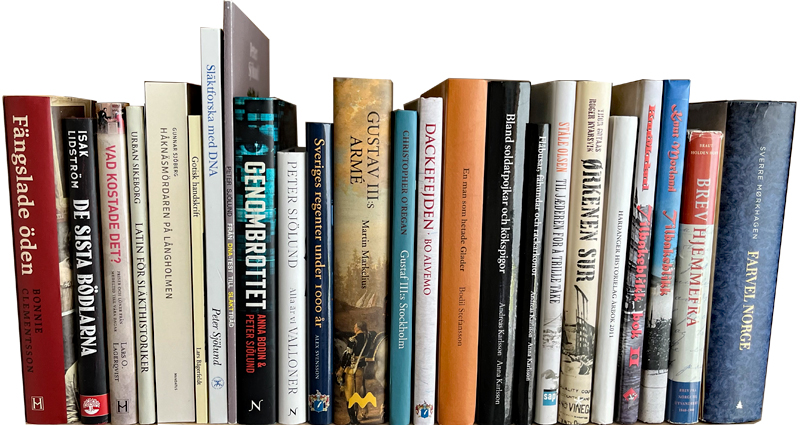 En släktforskares bokhylla innehåller många olika böcker beroende på behov. Min bokhylla innehåller en mängd böcker allt från renodlade släktforskningsböcker, till historia, personberättelser och böcker om vikingarnas bedrifter. Väljer att presentera några medan andra får stå kvar i bokhyllan.